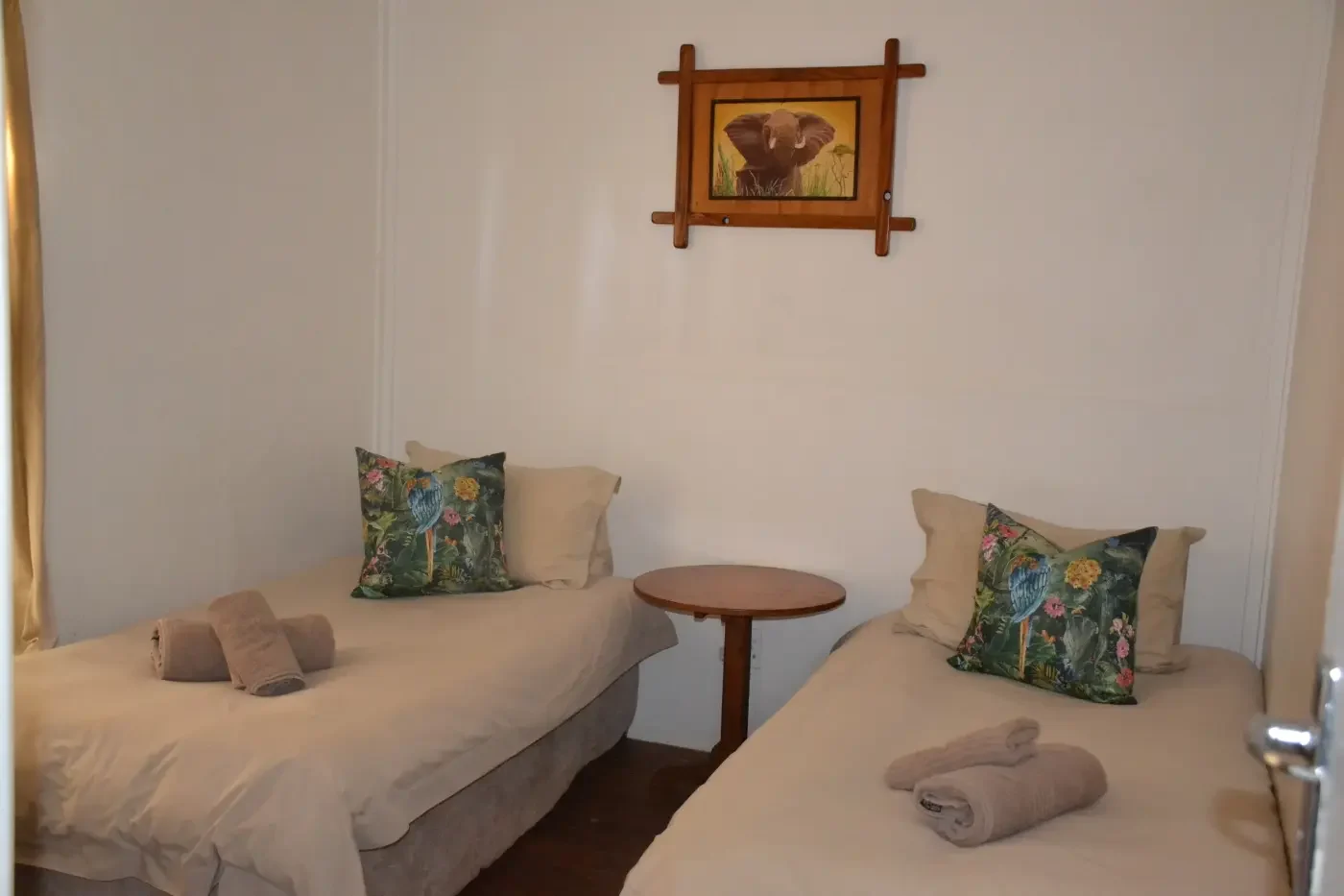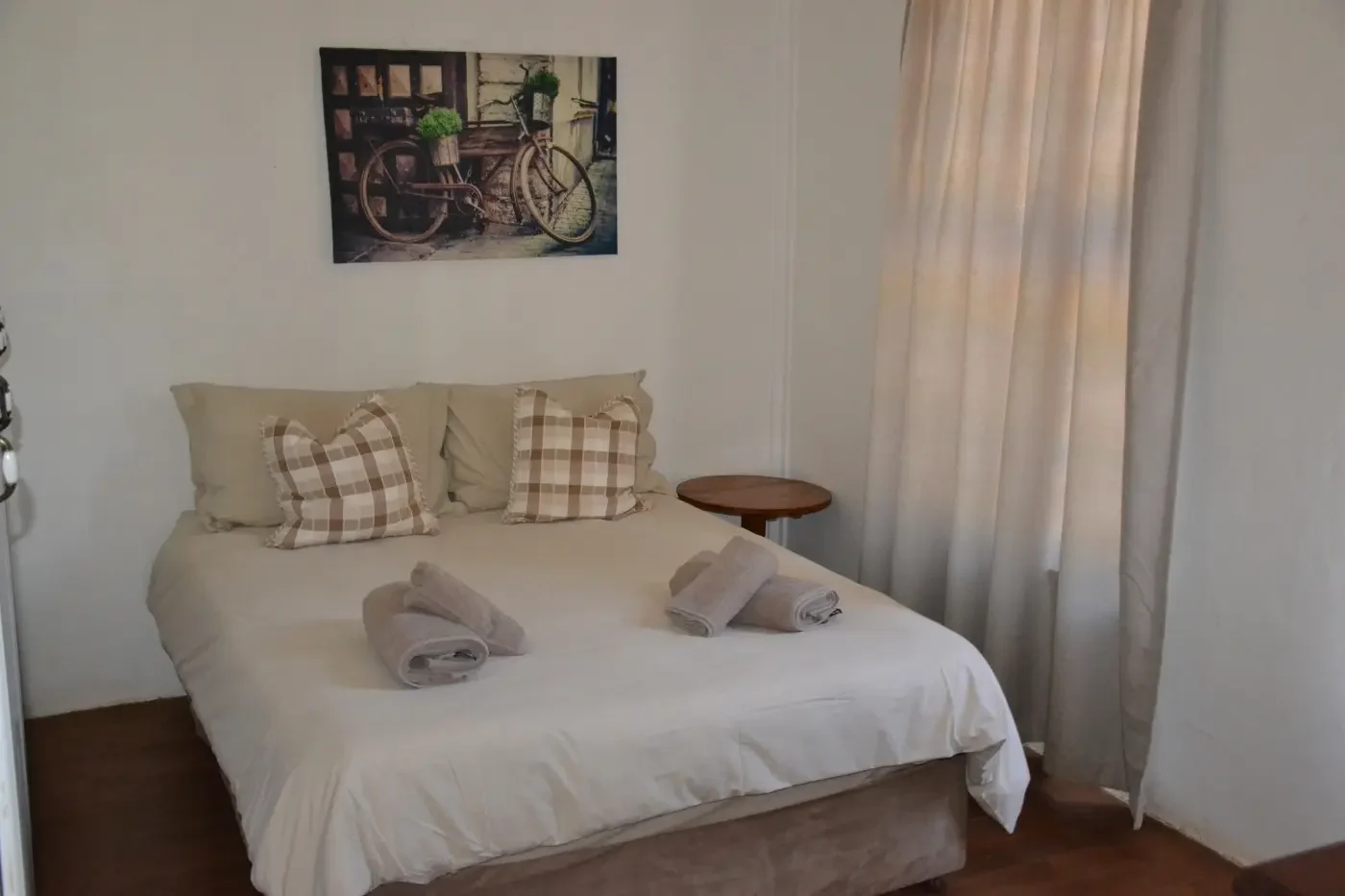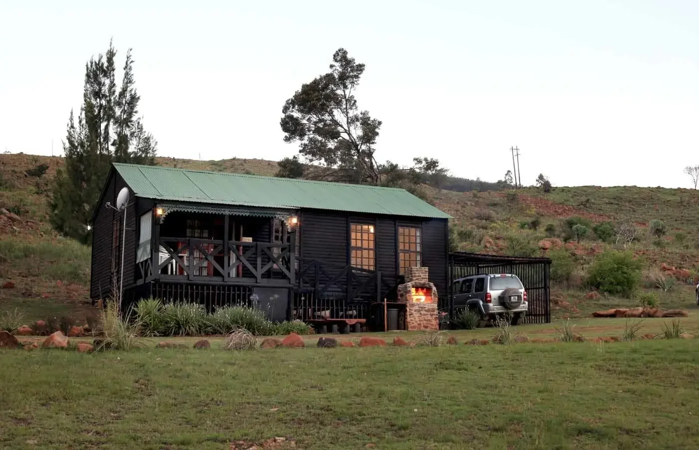 With stairs leading up to the log cabin, it offers 2 bedrooms, a bathroom with a bath and a shower. It includes a living and dining area, a kitchenette with a gas stove and a patio with a view over the dam and the mountain.